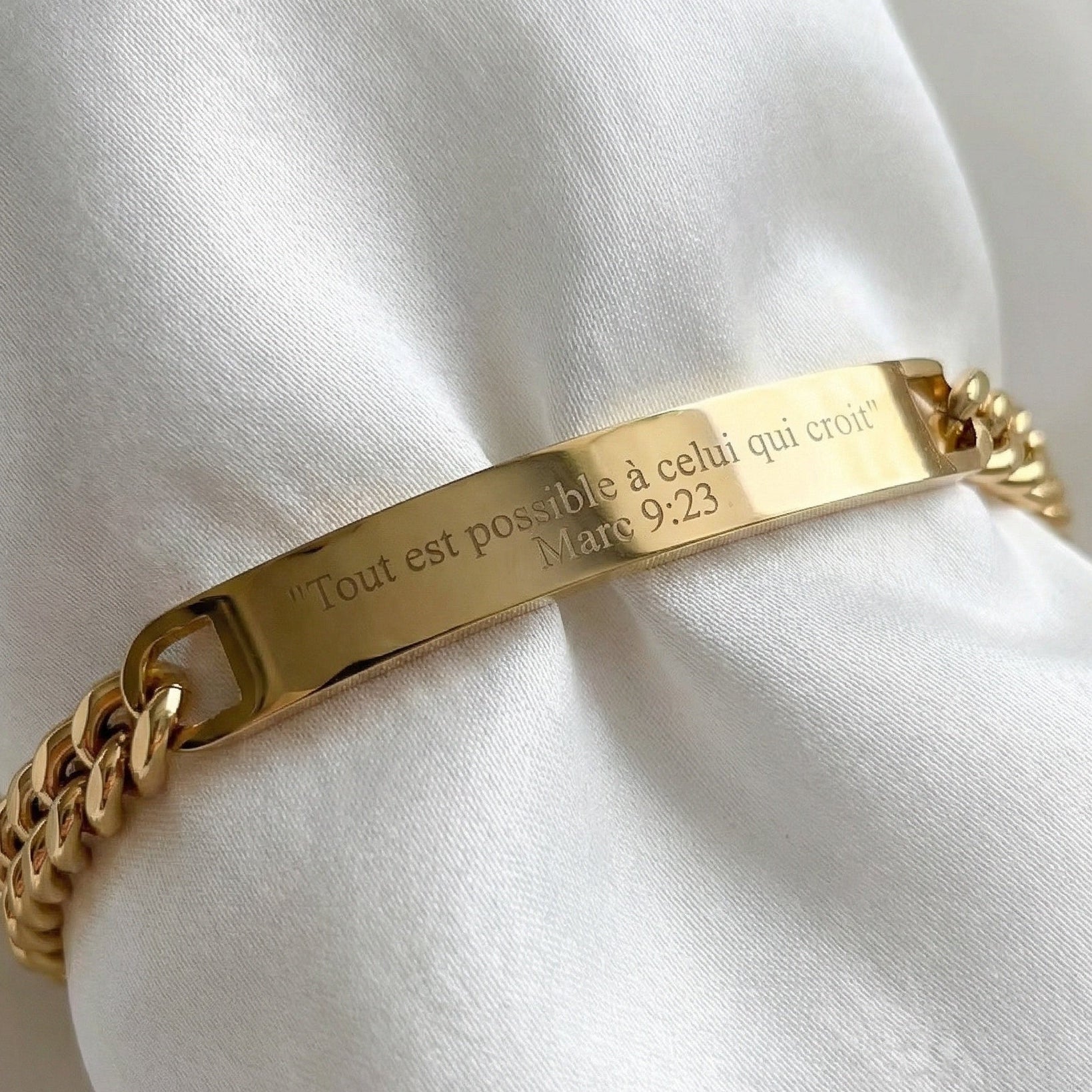 Les versets gravés sur nos bracelets proviennent de la Bible. Nous choisissons des passages porteurs de foi, d’espoir et d’amour, pour accompagner chacun dans son chemin spirituel. Tu peux aussi personnaliser ton bracelet avec le verset de ton choix.