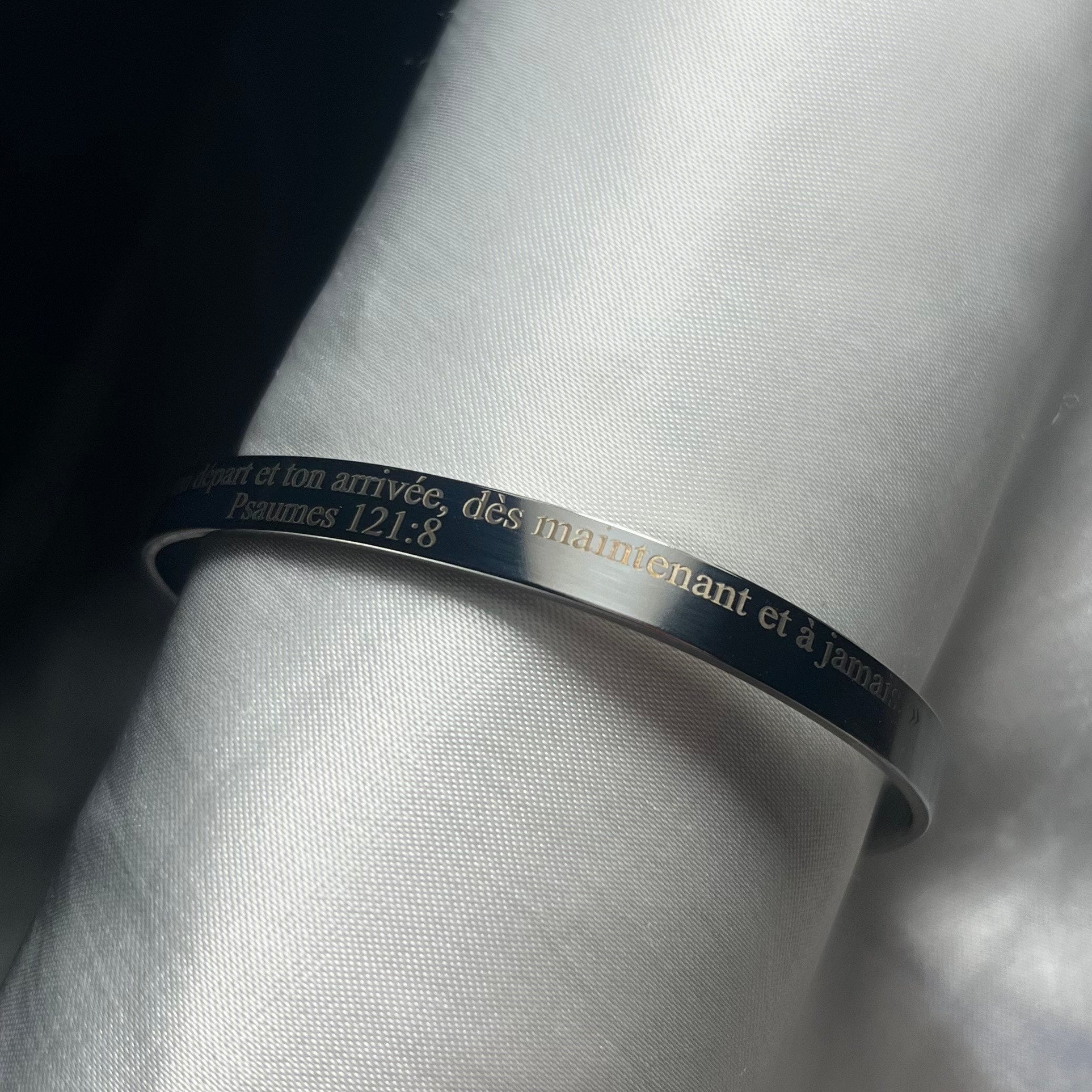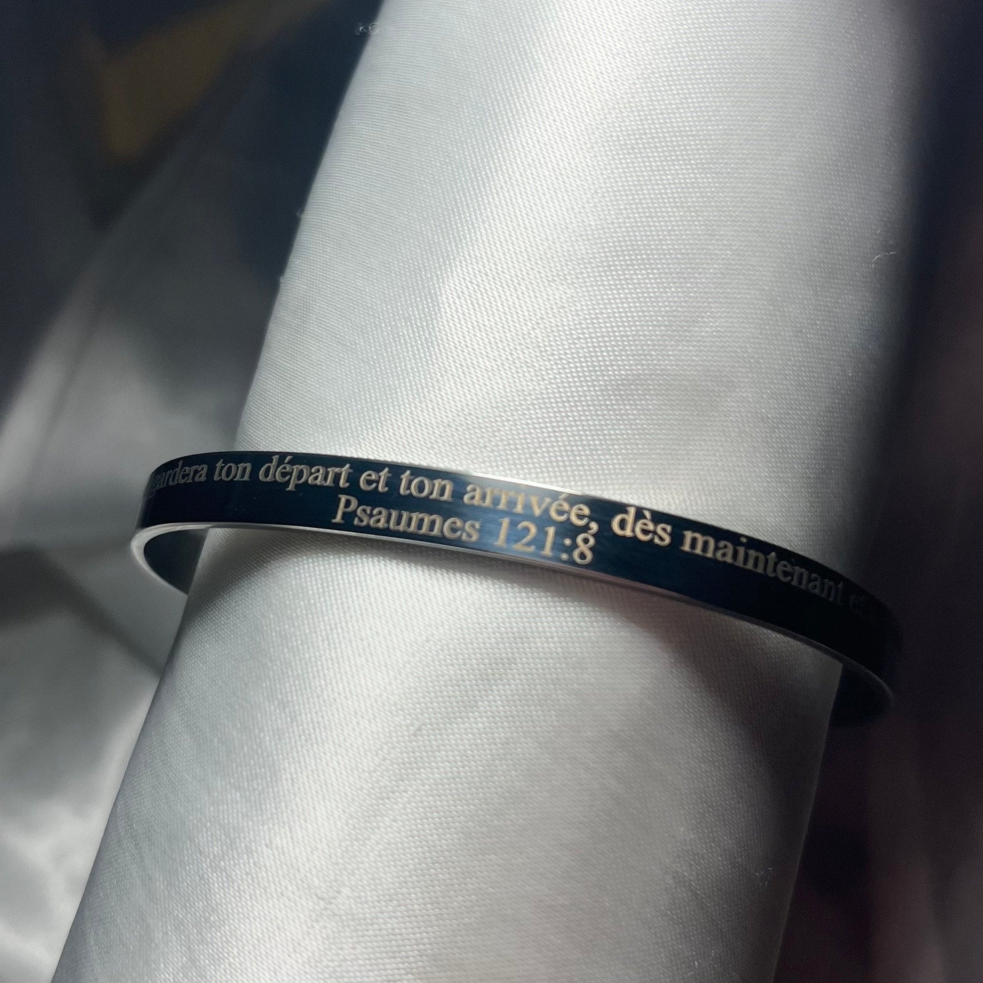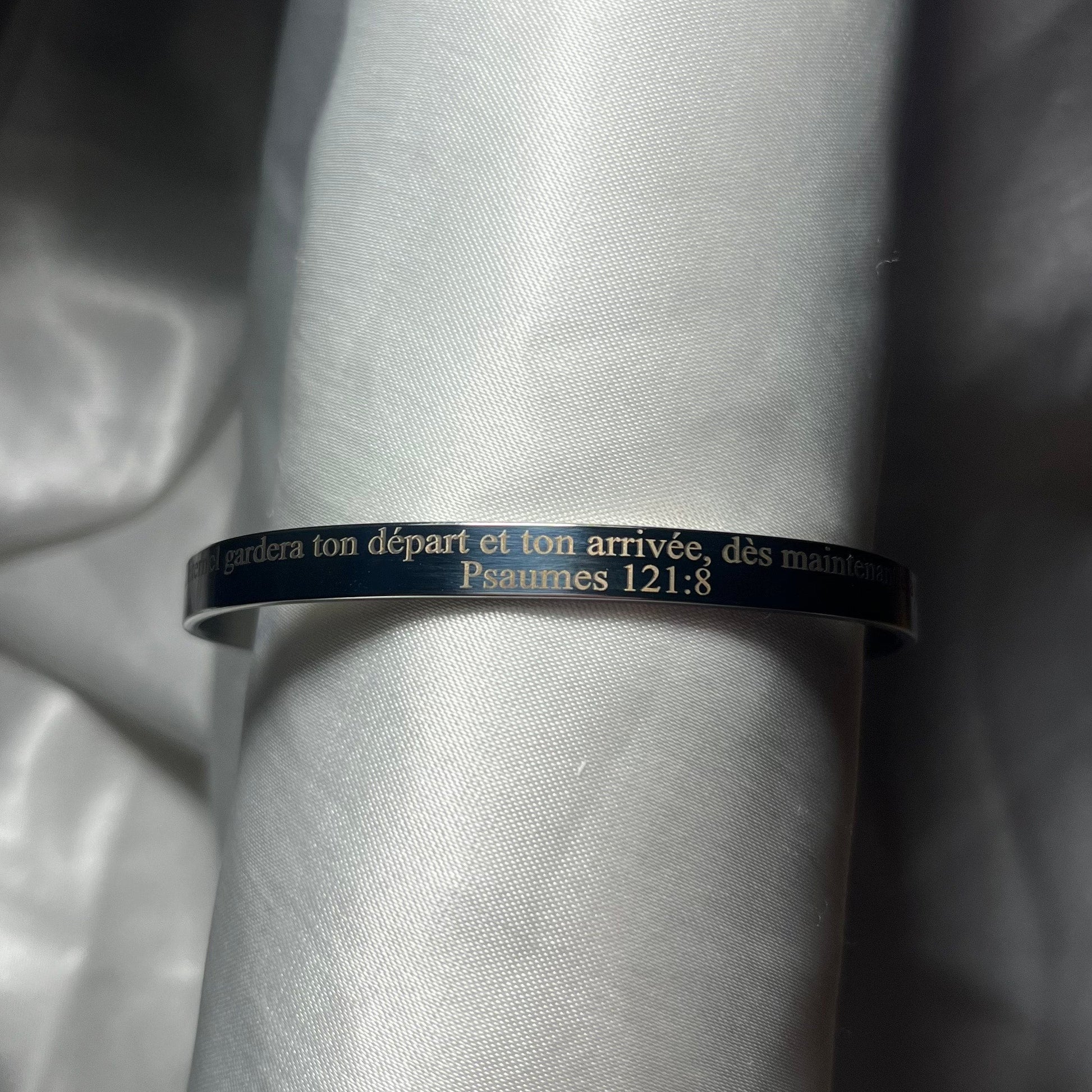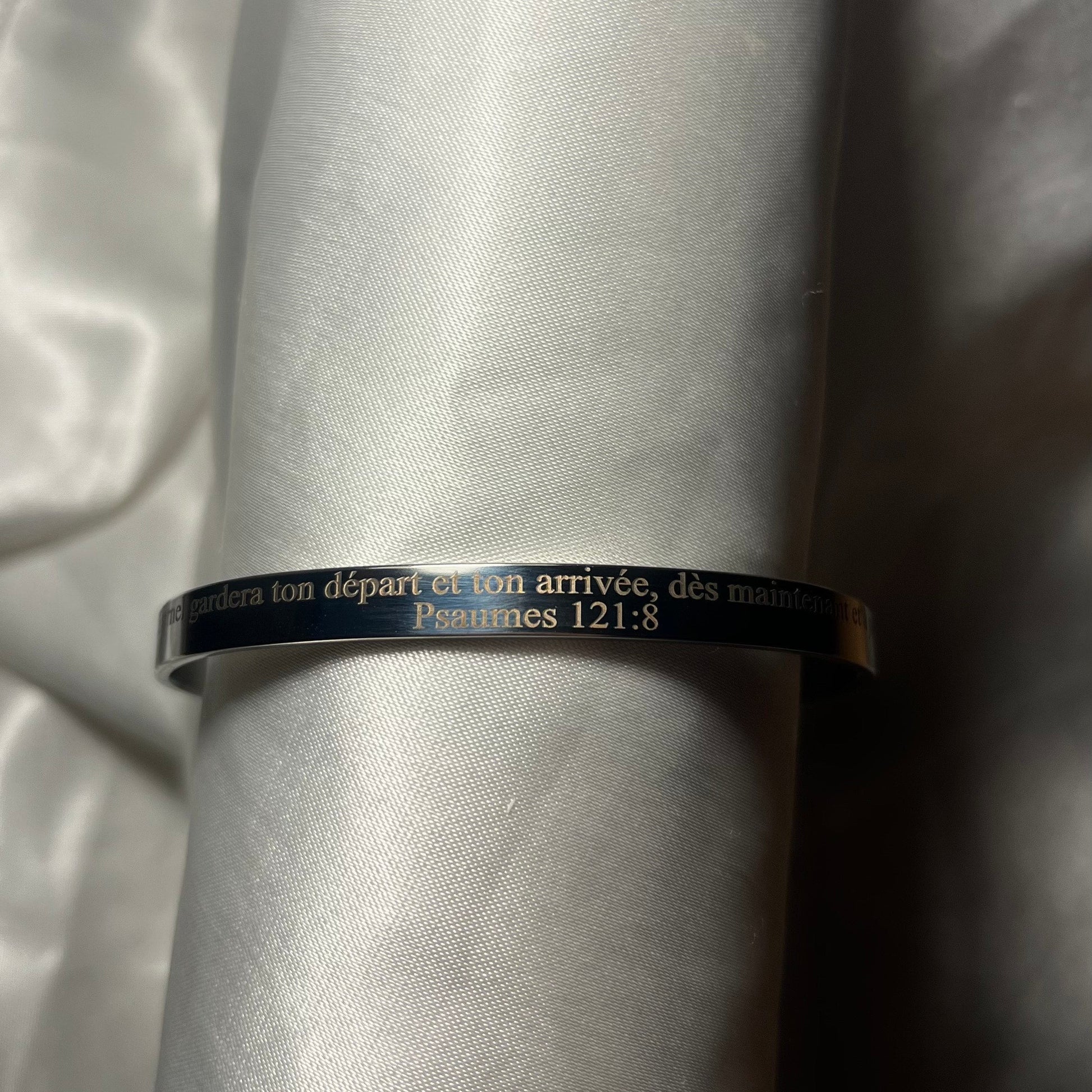 Ce bracelet jonc incarne l’élégance, la foi et la profondeur spirituelle. Très apprécié et souvent demandé, il se distingue par sa gravure fine, lisible et durable, portant un verset biblique puissant qui rappelle que la véritable joie se trouve dans la proximité de Dieu.