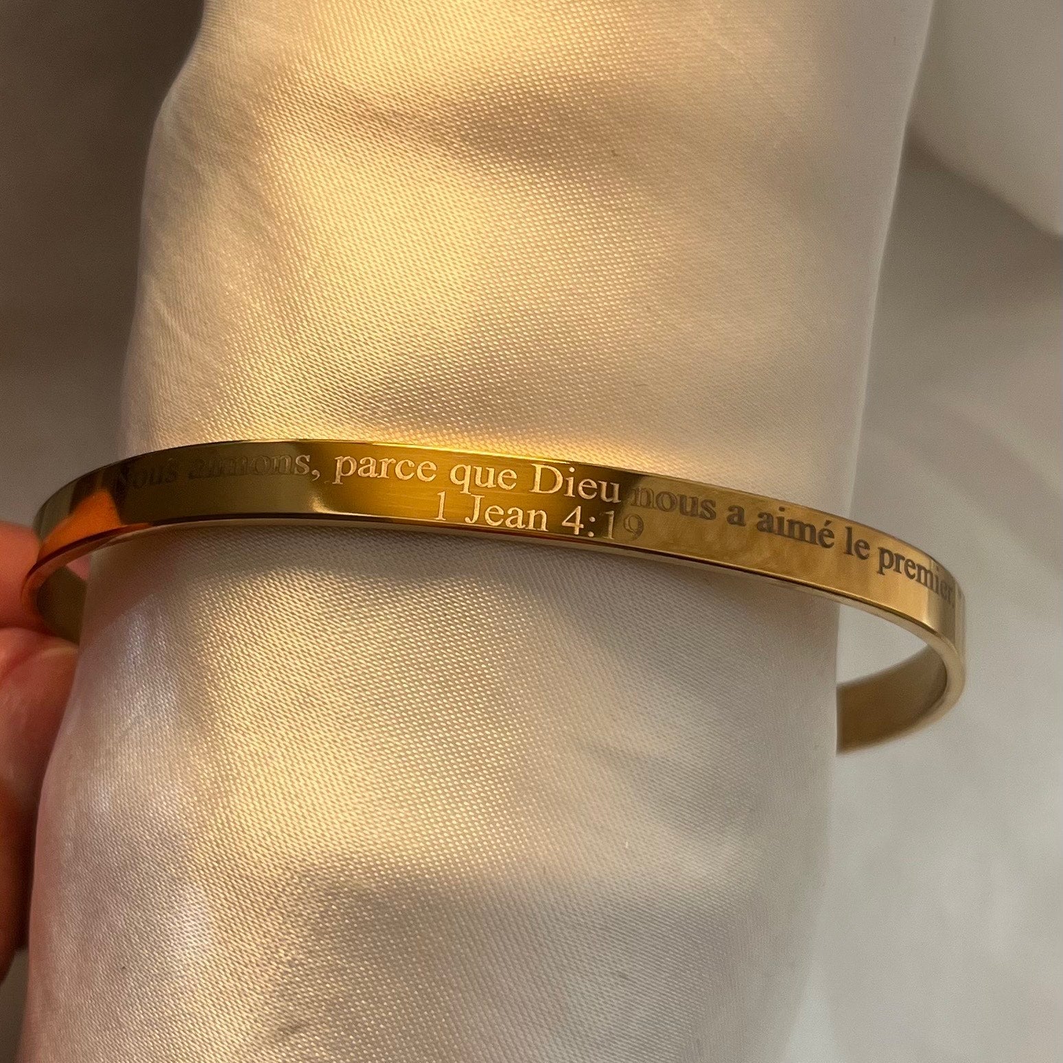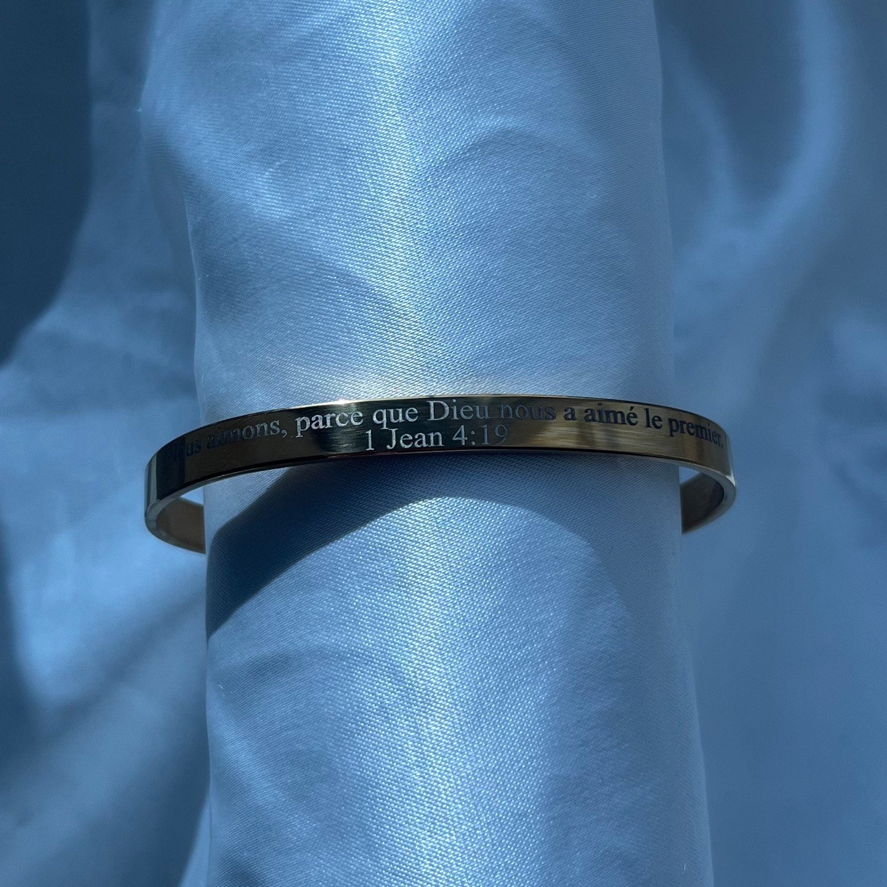 Ce bracelet jonc incarne l’élégance, la foi et la profondeur spirituelle. Très apprécié et souvent demandé, il se distingue par sa gravure fine, lisible et durable, portant un verset biblique puissant qui rappelle que la véritable joie se trouve dans la proximité de Dieu.